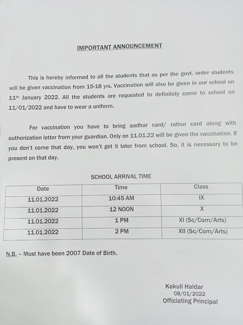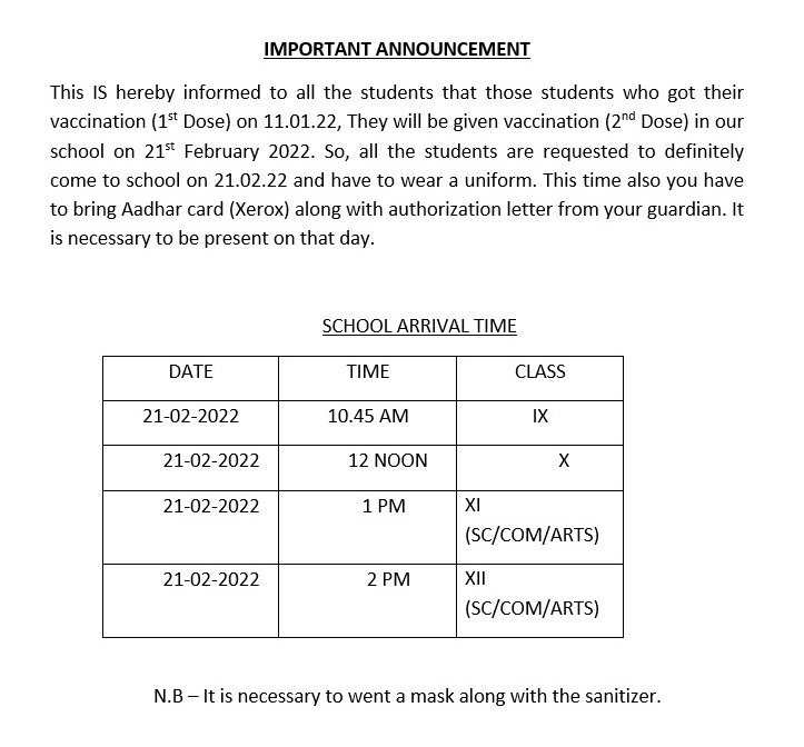 school will reopen from 03/02/22 (Thursday) from Classes VIII to XII. Classes VIII to XII students will come to school at 10.30 am by their own convenience.